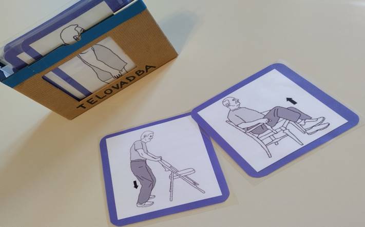 - Slika “Kartice za telovadbo”: Ta material lahko uporabimo, ko oseba nima ideje, katero vajo bi pokazala ob skupinski telovadbi, ali ko morda zna nekaj povedati, ne zna pa več demonstrirati in lahko samo pokaže kartico ter v skupini sodeluje na ta način. Aktivnost lahko stopnjujemo tako, da na hrbtno stran dodamo opise vaj, ki jih oseba lahko prebere ter na ta način krepi sposobnost prenašanja neke informacije iz besednega na nivo aktivnosti, krepi tudi sposobnost sledenja navodilom.