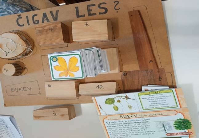 - Slika “Čigav les”: Gre za material, ki preko tipne in vidne zaznave spodbuja sodelovanje, sortiranje koščkov lesa na pravo mesto. Taka aktivnost je smiselna za osebo, ki se je tekom življenja ukvarjala z lesom, na primer mizar, upravitelj CNC stroja, tesar… Material je zasnovan tako, da so koščki lesa oštevilčeni, prav tako pa obris lesa kaže na pravilen odgovor. Aktivnost lahko stopnjujemo z vključevanjem večih inforfmacij, lahko pridružimo opis drevesa, plodov, za kaj so plodovi uporabni ipd.