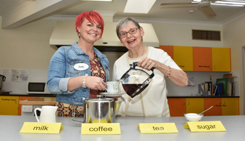 - Slika “Dve gospe, ki kuhata kavo.”: To je praktičen prikaz načina, ki spodbuja samostojnost osebe. Delovna terapevtka uporabi sposobnost vidne zaznave tako, da gospe označi korake za pripravo kave ter zapiše sestavine, ki jih mora gospa uporabiti. Na ta način krepi sposobnost organizacije aktivnosti ter pomaga kratkoročnemu spominu, da lažje usvoji postopek. Namen je seveda samostojnost osebe, nasproti temu, da bi nekdo skuhal kavo namesto gospe.