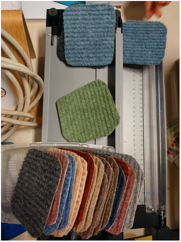 - Slika “Koščki tapisona”: Ta material se lahko uporablja kot spomin, spodbuja tipno in vizualnon zaznavanje. Aktivnost lahko stopnjujemo na način, da koščke med sabo primerjamo, se pogovarjamo o tem katera barva tapisona bi sodila h kakšni steni, koščke lahko med sabo se sestavljamo po barvah mavrice, ipd.