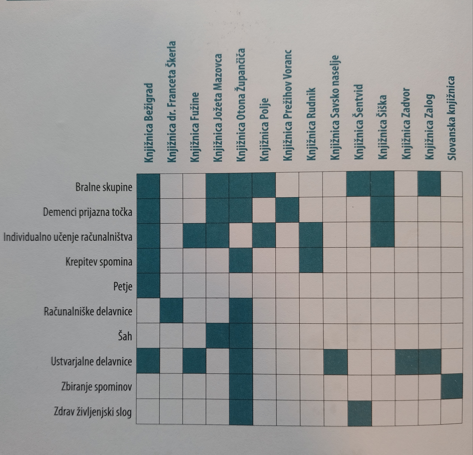 V enotah Mestne knjižnice Ljubljana so na voljo različne aktivnosti, ki so za člane knjižnice brezplačne. Članska izkaznica je mestna kartic Urbana, članarina je za upokojence znižana (11 evrov na leto). Na spodnji sliki so navedene aktivnosti, za več iformacij pa lahko pokličete posamezno knjižnico. Informacije na https://www.mklj.si/.